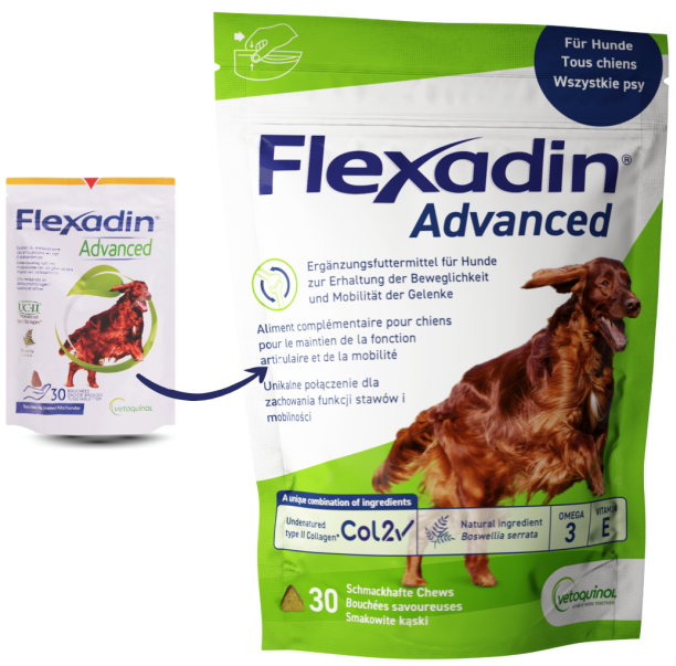FLEXADIN ADVANCED DOG 30 tab. ( Caniviton pies stawy mobility psy arthritis ) -wygodne żujki kiedyś żelki bo zmiana opakowania oraz nazwy ale skład jest ok i są skuteczne w przebudowie chrząstki stawowej