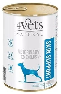 4VETS NATURAL - SKIN SUPPORT NEW DOG 400 G - pełnoporcjowa dietetyczna karma zalecana do stosowania u psów z objawami dermatologicznymi oraz w przypadku niepożądanych reakcji ze strony układu pokarmowego na składniki pokarmowe .