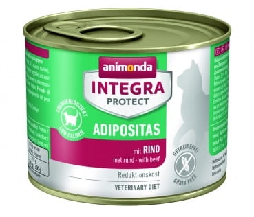 AN INTEGRA PROTECT ADIPOSITAS KOT PUSZKA 200 G to mokra karma stworzona z myślą o mruczkach borykających się z nadwagą . Dzięki znacznie obniżonej zawartości składników energetycznych , większej ilość wysokowartościowego białka i mniejszej ilości tłuszczu pokarm ten ułatwia zmniejszanie wagi .