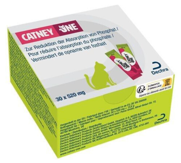 Dietetyczna mieszanka paszowa uzupełniająca dla kotów wspierająca czynność nerek w przypadku chronicznej niewydolności nerek . Zmniejsza wchłanianie fosforu . Skład : Maltodekstryny (wytworzone z ziemniaków i kukurydzy ) . Dodatki :węglan lantanu , oktahydrat (4d23) 880 g/kg. Skład analityczny : białko surowe (1%) , włókno surowe (8-10%) , oleje i tłuszcze surowe (0%) , popiół surowy (60%) , wapń (0%) , fosfor (0%) , potas (0%) , sód (0%) . Dawkowanie : Podaje się jedną saszetkę dziennie Catney One z karmą dla kota . Wstępny zalecany czas podawania to 6 miesięcy . Zawartość saszetki można podzielić i podać 1 opakowania dwa razy dziennie . W tym okresie należy unikać podawania kotu pokarmów zawierających duże ilości fosforu . Zawsze należy zapewnić kotu stały dostęp do świeżej wody do picia . 1. Rozerwać saszetkę podłużną na jej krótszym końcu 2. Posypać granulkami karmę dla kota 3. Starannie wymieszać granulki z karmą dla kota 4. Podać kotu gotową mieszaninę .
