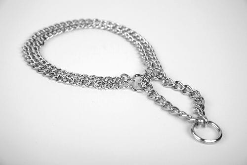 DINGO obroża łańcuszkowa zaciągana, podwójna. Szeroka i bardzo dekoracyjna. Tego typu obroże mają ograniczoną strefę zaciskową. Trzeba pamiętać, że metal w zimie robi się zimny a w czasie opałów potrafi się bardzo nagrzewać.