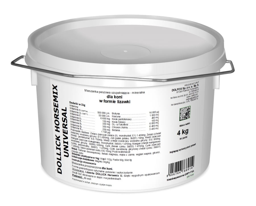 DOLFOS DOLLICK HORSEMIX UNIVERSAL 4 KG - LIZAWKA to wieloskładnikowa mieszanka uzupełniająca dla koni , zaopatrująca organizm w niezbędne makro- i mikroelementy , witaminy oraz aminokwasy . Uzupełnia niedobory w paszach podstawowych . Wysoka koncentracja większości składników zawartych w DOLFOS DOLLICK HORSEMIX UNIVERSAL 4 KG - LIZAWKA umożliwia ułożenie optymalnej dawki pokarmowej .