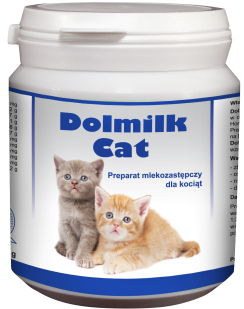 Preparat mlekozastępczy dla kociąt , Właściwości : pełnowartościowe zastępcze mleko dla kociąt zawierające najwyższej jakości składniki w optymalnej ilości i proporcji . Zawarte w nim białko jest wyłącznie pochodzenia mlecznego . Homogenny tłuszcz w postaci mikrocząsteczek jest doskonale przyswajalny . Preparat uzupełniają witaminy, aminokwasy (w tym tauryna ) , makro i mikroelementy oraz laktoza na bezpiecznym poziomie . DOLMILK CAT pokrywa w pełni potrzeby żywienia kociąt wszystkich ras , gwarantuje ich właściwy wzrost i rozwój . Wskazania :