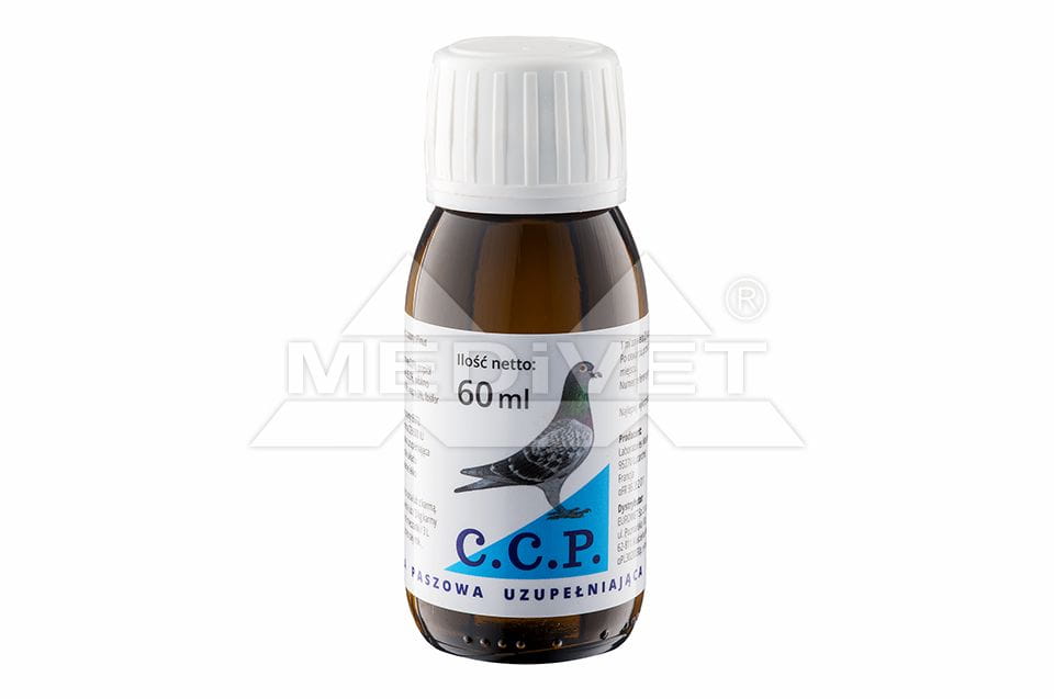 C.C.P. 60 ML - preparat łączy w sobie działanie kreozotu ( produkt destylacji smoły drzewnej z drewna bukowego ) i terpentyny ( pineany ) . Mieszanka ta działa przeciwbakteryjnie i pobudzająco na nabłonki układu oddechowego ( efekt wykrztuśny ) oraz nieznacznie moczopędnie . Stosowanie i dawkowanie : Podawać do picia lub z karmą . profilaktycznie 5 ml na 3 litry wody lub 3 kg karmy co 15 dni przez cały rok , leczniczo 5 ml na 3 litry wody lub 3 kg karmy przez 3 do 5 dni .
