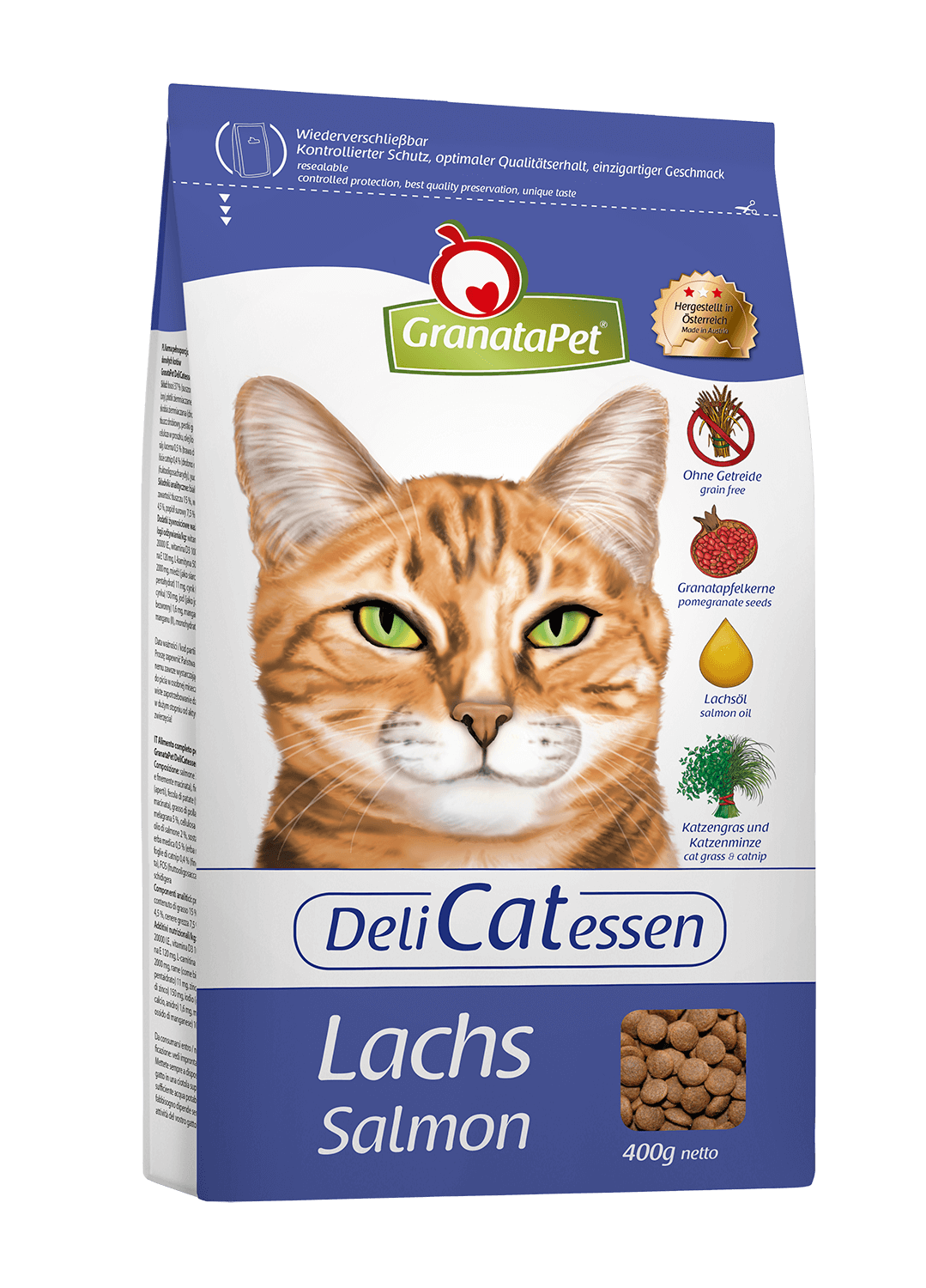GRANATAPET ADULT ŁOSOŚ 300 G to karma pełnoporcjowa dla dorosłych kotów . Koty z natury są głównie drapieżnikami i smakoszami . Z tego względu odpowiada im w szczególności żywność bogata w proteiny i charakteryzująca się odpowiednią zawartością tłuszczu . Wysoka zawartość mięsa w połączeniu z pestkami granatu , olej łososia oraz świadoma rezygnacja ze zboża wpływają pozytywnie na system immunologiczny i ochronę komórkową , nie obciążając nerek . Państwa ulubieniec będzie miał zapewnione optymalne , naturalne pożywienie , które dostarcza jednocześnie niepowtarzalnych doznań smakowych . Wysokowartościowy , skład ma pozytywny wpływ na skórę i futro , które są zwierciadłem zdrowia .