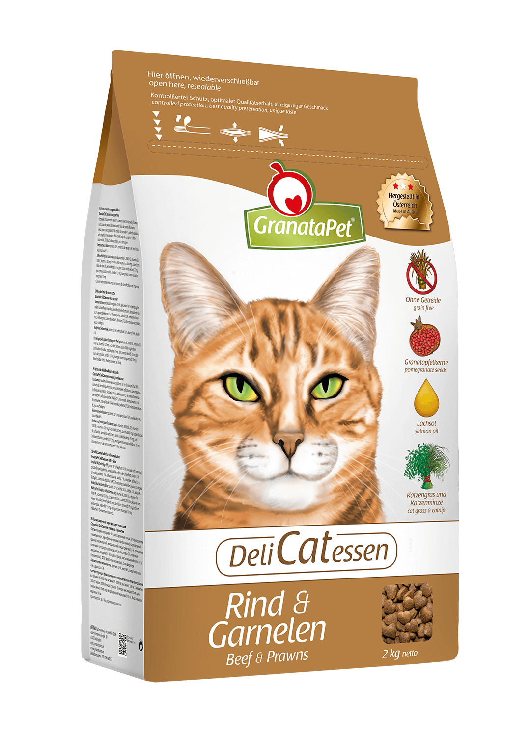 skwarki wołowe 18% , mięso drób 18% ( suszone i drobno mielony ) , płatki ziemniaczane ( rozpuszczone ) , skrobia ziemniaczana ( drobno mielony ) , tłuszcz drobiowy , krewetki 8,5% , pestki granatów 4% , celuloza w proszku , olej łosoś 2% , minerały , lucerna 0,5% ( trawa dla kotów ) , liście catnip 0,4%