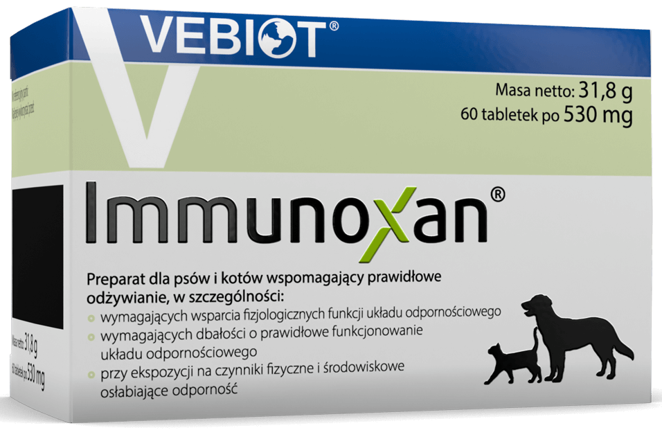 Preparat przeznaczony jest do uzupełnienia diety kotów , szczeniąt i dorosłych psów , w szczególności osobników wymagających wzmocnienia układu immunologicznego . W okresie szczepień , w trakcie lub po antybiotykoterapii , w stanach nawracających infekcji . Składniki zawarte w Immunoxan uzupełniają dietę i stymulują szybsze powstawanie odporności poszczepiennej . Skład : beta glukan , Aloe vera .