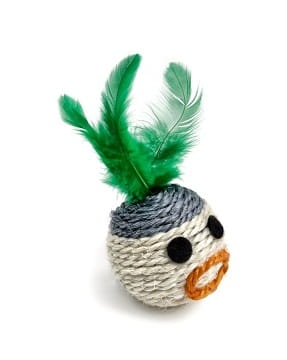 JK 58652 GŁOWA Z PIÓRKAMI 6 CM to zabawka klekocząca z piórkami dla kota, wykonana ze sznurka sizalowego.