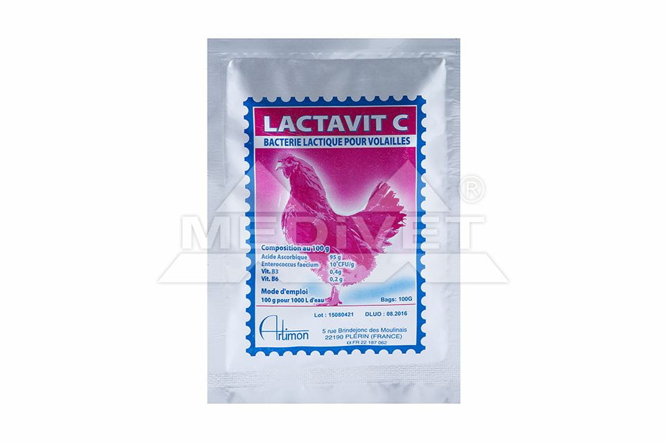 LACTAVIT C 100 G to preparat probiotyczny zasiedlający przewód pokarmowy ptaków naturalną florą bakteryjną . Poprawia zdrowotność stada , zwiększa dzienne przyrosty i redukuje problem biegunki .