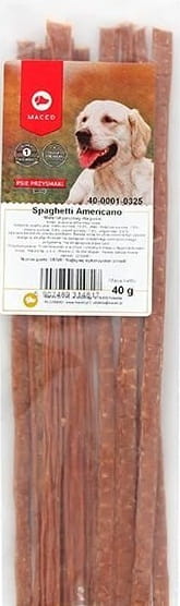 MACED SPAGHETTI 40 G ( przekąska gryzak suchy ) -fajowe bo cienkie paski do gryzania szczególnie dla yorkowatych i takowych małych piesiurków -małe wygodne opakowanie i chyba smaczne bo nasze to uwielbiają a cenowo w sklepie ezoo.pl jest przyzwoicie a jeszcze dostaliśmy w paczce mikołajkowy prezencik dla piesków- miłe Dziękujemy