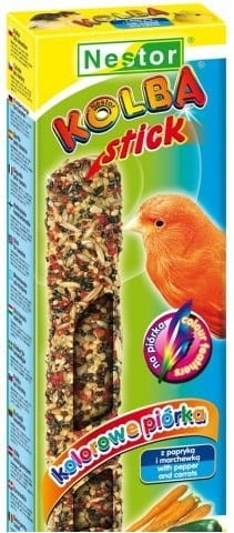 NESTOR KOLBA DLA KANARKA KOLOROWE PIÓRKA PAPRYKA Z MARCHEWKĄ 2 SZT / 85 G to niezwykły pokarm , którego wszystkie składniki zostały starannie dobrane zgodnie z potrzebami i upodobaniami Twojego ulubieńca . Jest doskonałym źródłem niezbędnych dla prawidłowego rozwoju organizmu witamin , mikro- i makroelementów . Kolba , dzięki stanowiącej jej trzon drewnianej listewce , pomaga ścierać przerosty siekaczy . Ponadto zwierzęta wyskubują ziarenka samodzielnie , podobnie jak ma to miejsce w naturalnym środowisku . Zdobywanie pożywienia zmienia się we wspaniałą zabawę i przynosi radość .