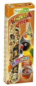 NESTOR KOLBA DLA ŚREDNICH PAPUG MIODOWA 2 SZT. to niezwykły pokarm, którego wszystkie składniki zostały starannie dobrane zgodnie z potrzebami i upodobaniami Twojego ulubieńca. Jest doskonałym źródłem niezbędnych dla prawidłowego rozwoju organizmu witamin, mikro- i makroelementów. Kolba, dzięki stanowiącej jej trzon drewnianej listewce, pomaga ścierać przerosty siekaczy. Ponadto ptaszki wyskubują ziarenka samodzielnie, podobnie jak ma to miejsce w naturalnym środowisku. Zdobywanie pożywienia zmienia się we wspaniałą zabawę i przynosi radość.