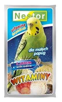 NESTOR WITAMINY DLA MAŁYCH PAPUG Z JODEM 20 G to mieszanka ziaren nasączonych roztworem jodu . Jod jest niezbędny dla prawidłowego funkcjonowania tarczycy , która wytwarza hormony , regulujące ważne procesy metaboliczne . Witaminy z jodem powinny stać się stałą pozycją w jadłospisie Twojego ptaszka , a już koniecznie , jeśli Twoim ulubieńcem jest papużka falista ; jest ona bowiem w szczególności narażona na choroby związane niedoborem tego ważnego pierwiastka . Ze względu na obecność jodu , mieszanki nie powinno się podawać oddzielnie . Zawartość jednej torebki należy wymieszać z następującymi ilościami podstawowego pokarmu : dla papug małych ( np. papużki faliste ) z 1 kg , dla papug średnich ( np. nimfy ) z 0,5 kg . Powyższe ilości dotyczą ptaków dorosłych .