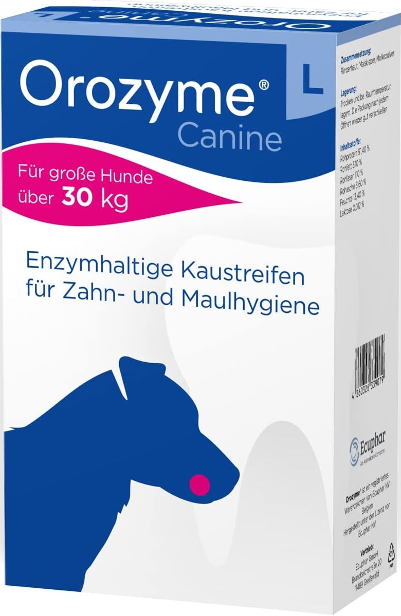 Kolagenowe paski do żucia dla psów zawierające naturalne enzymy , zapobiegają odkładaniu płytki bakteryjnej i w efekcie powstawania kamienia nazębnego . Preparat zawiera opatentowaną formułę enzymatyczną , która usprawnia przeciwbakteryjne działanie śliny psów . Ponadto do OROZYME COLLAGEN STRIPS dodano dodatkowe substancje antyseptyczne , których zadaniem jest ograniczenie liczby bakterii odpowiedzialnych za przykry zapach i powstawanie płytki nazębnej i kamienia nazębnego . Płatki nie rozpadają się podczas żucia . Skład : składniki pochodzenia zwierzęcego ( kolagen ) , słód , aromat naturalny i substancji aromatycznych . Wartość odżywcza : Białko ogólne : min. 74,5% , Tłuszcz: min. 1,5% , Włókno surowe: maks. 1,0% , Wilgotność : maks. 18,0%