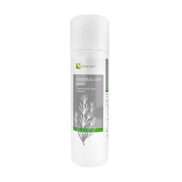 OVER KANIBAL OFF GREEN FLAIROSOL 300 ML jest produktem ograniczającym występowanie aktów kanibalizmu . Produkt nanosi się opryskując miejsca pogryzione lub narażone na uszkodzenie . Dzięki zawartości nagietka , rumianku i szałwi , KANIBAL OFF GREEN wspomaga także regenerację uszkodzonych przez pogryzienie tkanek . Jego wyjątkowo gorzki smak skutecznie zniechęca osobniki agresywne do ataku . Ich eliminacja ze stada jest ułatwiona przez zastosowanie zielonego barwnika .