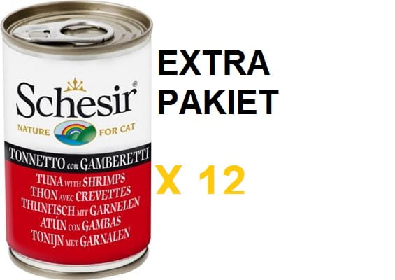 PAKIET 12 x Schesir puszka 140 g ( Koty tuńczyk krewetki ) dobra cena za taki pakiet bo pojedyncze sztuki zawsze wychodzą drożej ale jednak jest dostęp dp tej marki która na jakiś czas zniknęła z dostępności na rynku wysyłkowym