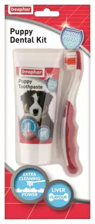 Zestaw do pielęgnacji zębów dla szczeniąt zawiera pastę do zębów oraz 2 szczoteczki do zębów.