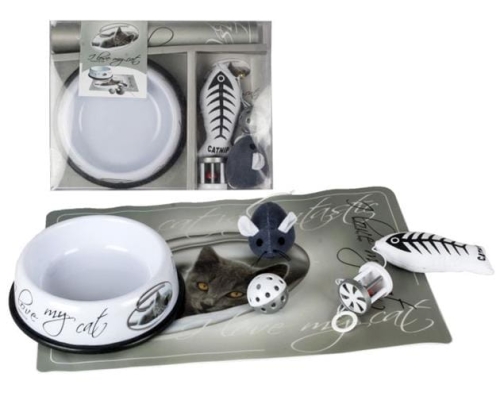 RIGA ELEGANCKI ZESTAW "I LOVE MY CAT"- MISKA, PODKŁADKA, ZABAWKI