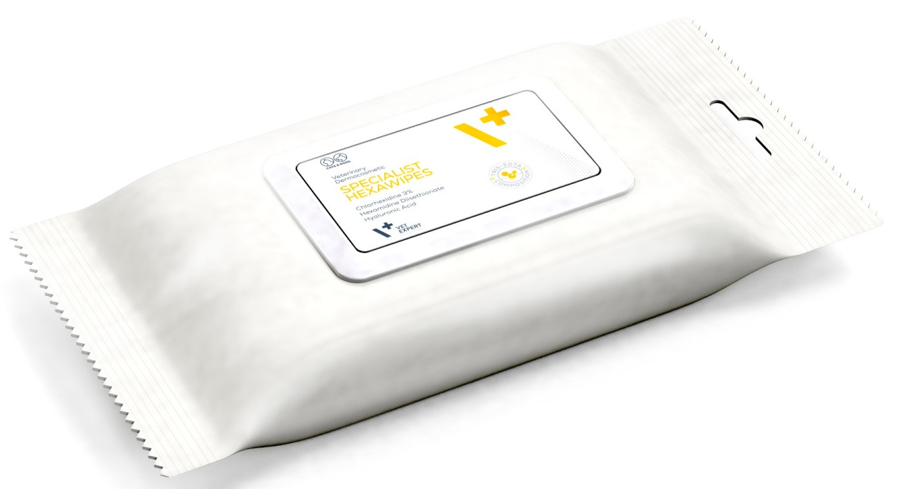 Praktyczne, nawilżane chusteczki są skutecznym elementem codziennej pielęgnacji skóry ze skłonnością do stanów zapalnych tła bakteryjnego lub grzybiczego . Nasączone są płynem bazującym na 3% chlorheksydynie oraz diizetionianie heksamidyny , dzięki czemu równoważą mikrobiom skóry , jednocześnie tworząc środowisko hamujące rozwój infekcji . Tris-EDTA potęguje działanie chlorheksydyny . Kompleks złożony z 5 rodzajów kwasu hialuronowego wykazuje silne właściwości nawilżające , łagodzące podrażnienia i zapewniające skórze zdrowe i sprawne funkcjonowanie . Delikatne chusteczki wykonane są w 100% z wiskozy , co czyni je wyborem bezpiecznym dla zwierzęcia i przyjaznym dla środowiska . SKŁADNIKI AKTYWNE : CHLORHEKSYDYNA 3% - równoważy mikrobiom skóry , jednocześnie tworząc środowisko hamujące rozwój infekcji . TRIS-EDTA - działa na ściany komórkowe bakterii Gram-ujemnych , osłabiając je i ułatwiając eliminację patogenów , dzięki czemu zwiększa skuteczność działania chlorheksydyny nawet 100-krotnie . HEKSAMIDYNA - składnik o działaniu przeciwgrzybiczym ; ma bardzo dobrą tolerancję , dzięki czemu jest bezpieczny i nie podrażnia skóry przy długoterminowym stosowaniu . HYDROLIZOWANE GLIKOZAMINOGLIKANY - wspierają równowagę hydrolipidową , pomagają w odbudowie macierzy międzykomórkowej . Stymulują syntezę kolagenu i elastyny , przyspieszając regenerację skóry . EKSTRAKT Z ALOESU - działa nawilżająco , łagodząco , dzięki czemu zmniejsza zaczerwienienie i łagodzi podrażnienia skóry . GLICERYNA - nawilża , dzięki zdolności wiązania wody w naskórku . Sposób użycia : Chusteczki są przeznaczone do jednorazowego użycia . Otworzyć pokrywkę i wyjąć chusteczkę . Następnie delikatnie wyczyścić skórę w miejscach pielęgnacji , używając obu stron chusteczki . Skórę zwierząt należy przecierać pod włos . Nie spłukiwać . Bezpieczne do codziennego stosowania u psów i kotów . Po skończonej czynności zamknąć pokrywkę opakowania , aby zabezpieczyć chusteczki przed wysychaniem .