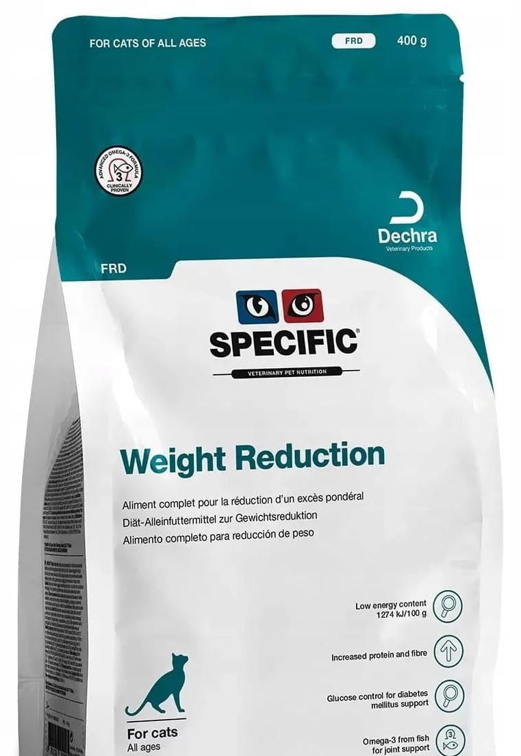 SPECIFIC CAT FRD WEIGHT REDUCTION 1,6 KG to dieta dla kotów z obniżoną kalorycznością . Podwyższona zawartość włókna i obniżona zawartość tłuszczu zapobiega otyłości zwierząt . Podwyższona zawartość białka – zapobiega utracie masy mięśniowej odchudzanych zwierząt . Dodatek kwasów tłuszczowych EPA i DHA – wspomagają prawidłowe funkcjonowanie stawów u otyłych kotów . Zapewniają zdrową skórę i lśniącą sierść . SPECIFIC CAT FRD WEIGHT REDUCTION 1,6 KG zakwasza mocz , pH moczu poniżej 6,4 ułatwia rozpuszczanie istniejących i zapobiega powstawaniu nowych kryształów i kamieni struwitowych . Kotom cierpiącym na cukrzycę zaleca się podawać dwa posiłki dziennie w celu utrzymania stałego stężenia glukozy we krwi . Czas ich podania zależy od rodzaju stosowanej insuliny oraz aktywności pacjenta .