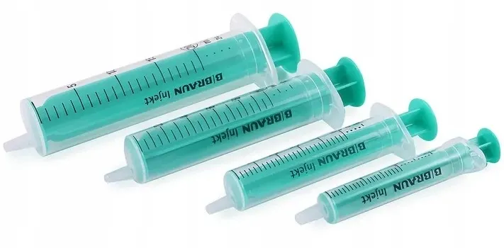 Dwuczęściowa strzykawka jednorazowego użytku została wykonana z polipropylenu /polietylenu . Strzykawka o zielonym tłoku posiada przezroczysty zbiornik oraz czarną podziałkę objętości o podwyższonym kontraście . Produkt nie zawiera silikonu i lateksu .
