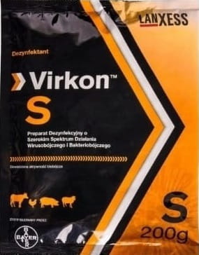 proszek do sporządzania roztworu wodnego - nie wysusza skóry -przeznaczony jest do stosowania w każdych warunkach , gdzie konieczne jest przeprowadzenie , dokładnej i skutecznej dezynfekcji . Wielu hodowców uważa VIRKON za najlepszy preparat do dezynfekcji . Może być stosowany w ogniskach chorób zakaźnych w tym w zwalczaniu pryszczycy , ptasiej grypy . Do odmierzania dawki preparatu polecamy wagi elektroniczne . Zastosowanie : Preparat utleniający , przeznaczony do dezynfekcji pomieszczeń dla zwierząt , sprzętu i środków transportu oraz jaj wylęgowych i wody przeznaczonej do picia dla drobiu . Do łatwego rozprowadzania VIRKON S 200 G można zastosować spryskiwacz 0,5 litra , którym łatwo dozować odpowiednią dawkę preparatu . Zakres działania : W zalecanych stężeniach preparat działa bakteriobójczo , wirusobójczo i grzybobójczo Sposób użycia : Preparat należy stosować na powierzchnie wstępnie oczyszczone i umyte , zarówno do przeprowadzenia dezynfekcji profilaktycznej jak i w warunkach zagrożenia epizootycznego . Preparat może być nanoszony na odkażane powierzchnie poprzez mycie , wycieranie , oprysk lub drobnokroplisty oprysk z użyciem aparatów ciśnieniowych . Dezynfekcja profilaktyczna : stosować roztwór 0 , 5-1 , 0 % ( 0,5/1kg preparatu rozpuścić w 100 litrach letniej wody , 5 , 0/10 , 0 g w 1 litrze letniej wody ) . Czas działania 30 - 60 minut .