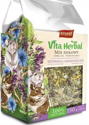 VITAPOL 4102 VITA HERBAL DLA GRYZONI MIX ZIOŁOWY DLA SZYNSZYLI 150 G to doskonała mieszanka uzupełniająca dla szynszyli i koszatniczek stanowiąca cenne źródło naturalnych witamin , minerałów i pektyn . W składzie ziołowej mieszanki znajduje się wiele naturalnych