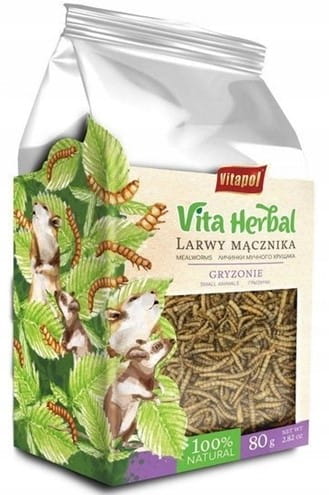 VITAPOL 4158 VITA HERBAL DLA GRYZONI LARWY MĄCZNIKA 80 G są popularnym , wysokokalorycznym jedzeniem , jakiego nie powinno zbraknąć w żadnym terrarium . Delikatnie ususzony mącznik nie traci swoich wartości odżywczych . Dobrze jest dodawać go do żywej karmy lub osobno jako przysmak .