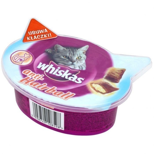 WHISKAS ANTI-HAIRBALL 50 G - ODKŁACZACZanie to smakowite przekąski wypełnione pysznym mięsnym nadzieniem z dodatkiem witamin i substancji mineralnych , które wspomagają usuwanie kłaczków z organizmu kota, a jednocześnie stanowią dla niego prawdziwy przysmak .